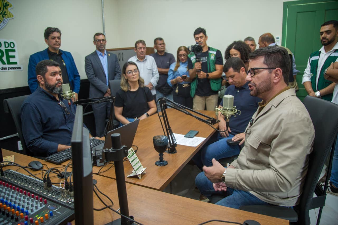 Ao inaugurar rádio nova, governador concedeu entrevista à rádio Aldeia. Foto: Dhárcules Pinheiro/Secom
