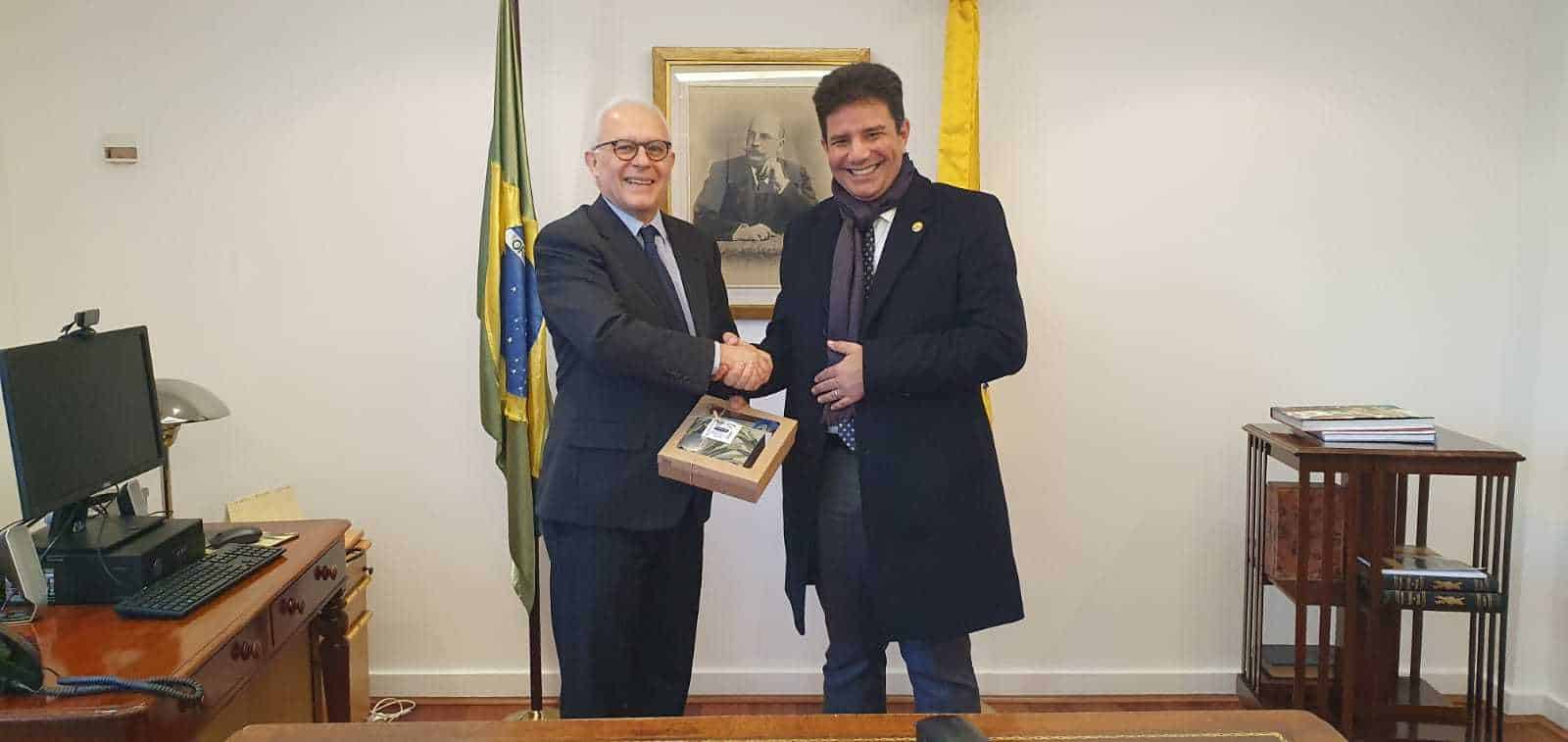 O governador foi recebido ainda nesta terça-feira, 2, pelo embaixador do Brasil em Londres, Marco Farani e pelo embaixador do Brasil junto ao Reino Unido, Fred Arruda. Cameli presenteou o embaixador Arruda com um produto feito em marchetaria, que é a arte do encaixe de madeiras em móveis, pisos, tetos.