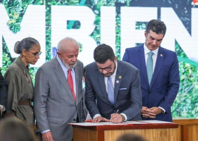 O governador Gladson Cameli assinou nesta quarta-feira, 5, um pacto com o governo federal que visa a prevenção e controle de incêndios na Amazônia – além do Pantanal. O ato ocorreu em solenidade alusiva ao Dia Mundial do Meio Ambiente, no Palácio do Planalto, com a presença do presidente Luiz Inácio Lula da Silva, da Ministra do Meio Ambiente, Marina Silva, e de outras autoridades federais e estaduais.