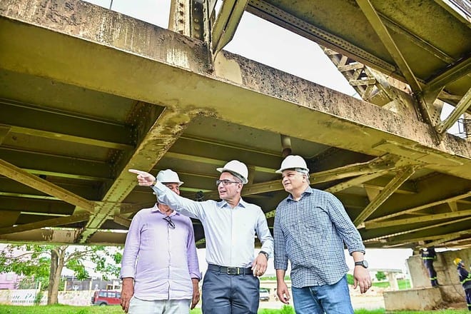O governador do Acre, Gladson Cameli, juntamente com representantes da empresa Procec, realizou na tarde desta quarta-feira, 22, uma visita às obras de reforço estrutural e elevação da Ponte Metálica Juscelino Kubitschek sobre o Rio Acre, no Centro de Rio Branco.