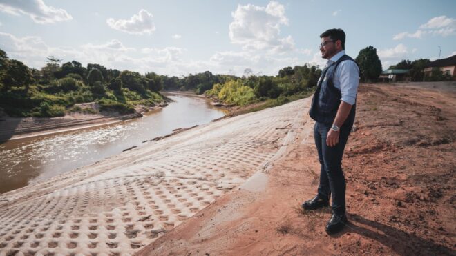 Na Orla do Rio Acre em Brasileia, a presidente do Deracre, Sula Ximenes, que acompanhou o governador na vistoria, ressaltou os aspectos técnicos da obra. “Estamos avançando na construção, com a execução de 408 metros de contenção, usando o sistema de bolsa creta e colcha creta, que garante mais estabilidade para a margem do rio. Essa etapa inclui também calçamento com concreto armado e instalação de gabiões. A proposta é recuperar a área central de Brasileia, que foi destruída pela enchente, e transformar esse espaço em uma área segura e bem estruturada para a população”, disse.