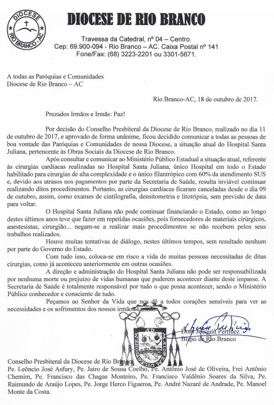 Um documento assinado pelo bispo Dom Joaquim Pertinez, responsável pela Diocese de Rio Branco, assinado na última quarta-feira (18), cancela a realização de cirurgias cardíacas no Hospital Santa Juliana pelo Sistema Único de Saúde (SUS). Segundo o bispo, o governo do Estado não está pagando o Hospital Juliana, unidade hospitalar gerida pela igreja. Além de cancelar a realização das cirurgias cardíacas, também foram canceladas exames de cintilografia, densitometria e litotripsia.