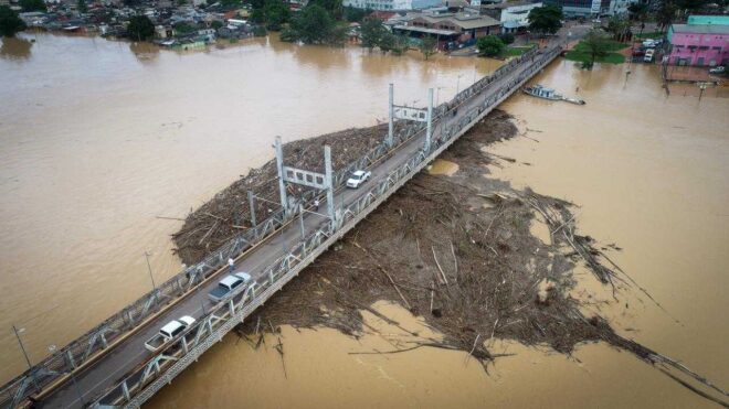 Nesta terça-feira, 28, o governo do Estado, por meio do Departamento de Estradas de Rodagem do Acre (Deracre), tem trabalhado, desde às 7h, com 60 homens equipados com coletes salva-vidas e luvas, com a ajuda de motosserras, para garantir a remoção dos entulhos e a continuidade do fluxo das águas na Ponte Juscelino Kubitschek, em Rio Branco.