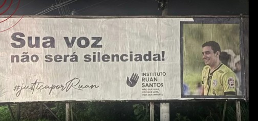 O advogado e árbitro Fábio Santos, pai deRuan Rhiler Rodrigues Santos, que morreu em novembro em um acidente de trânsito, acorrentou a motocicleta que o filho usava no momento da batida em um outdoor com um pedido de justiça. A fachada destaca também a criação de um instituto com o nome do jovem.