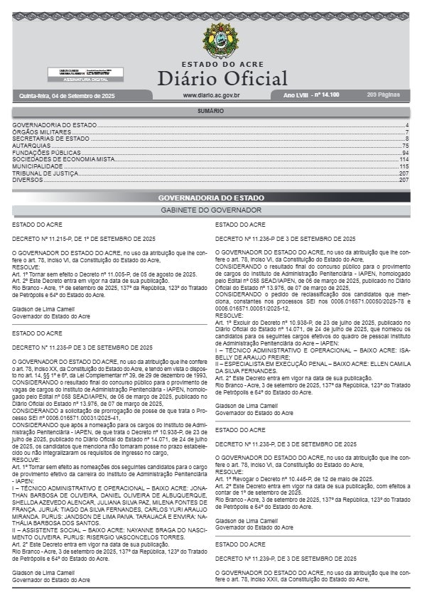 O governador Gladson Cameli (Progressistas) publicou no Diário Oficial do Estado desta quarta-feira, 03, o Decreto nº 11.235-P, que torna sem efeito a nomeação de candidatos aprovados no concurso público do Instituto de Administração Penitenciária do Acre (Iapen).
