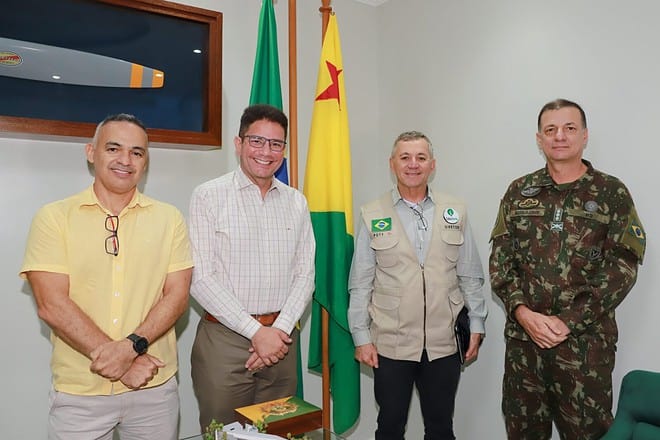 O governador Gladson Cameli recebeu na manhã desta quarta-feira, 8, o general do Exército Ubiratan Poty, diretor do Departamento do Programa Calha Norte (PCN), em seu escritório funcional, em Rio Branco.