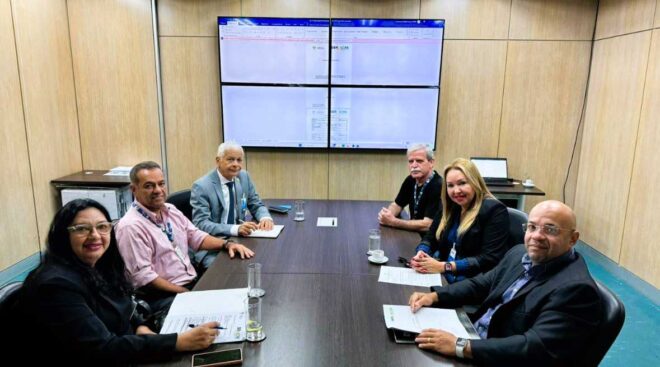 A reunião contou com a presença da diretora de Expansão e Planejamento do Deracre, Sula Ximenes; do chefe da divisão, Júlio Martins; e da chefe da Divisão de Convênios, Gina Maria Oliveira.
