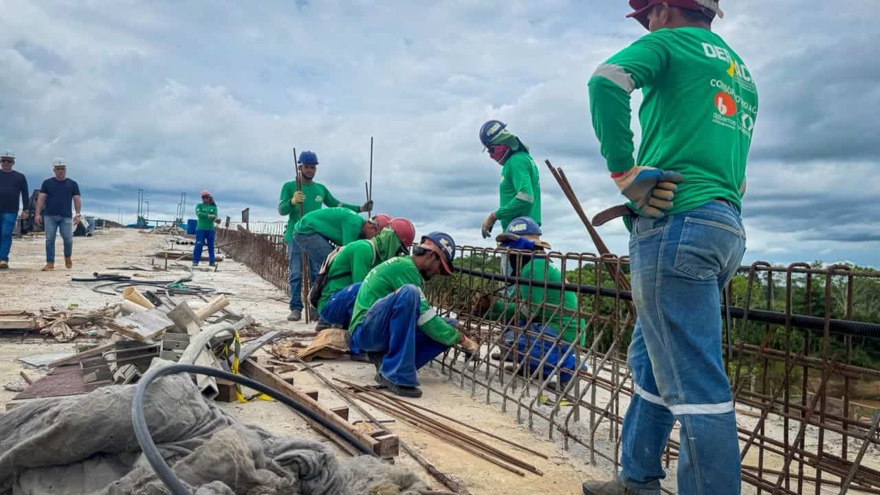 O governo do Acre, por meio do Departamento de Estradas de Rodagem, Infraestrutura Hidroviária e Aeroportuária (Deracre), intensifica os trabalhos nas etapas finais da construção da ponte sobre o rio Acre em Xapuri. A obra mobiliza cerca de 100 profissionais em dois turnos diários, concentrados na finalização da superestrutura e dos acabamentos. A presidente do Deracre, Sula Ximenes, ressaltou que a obra atingiu 96% de execução e destacou o impacto da ponte para a população.