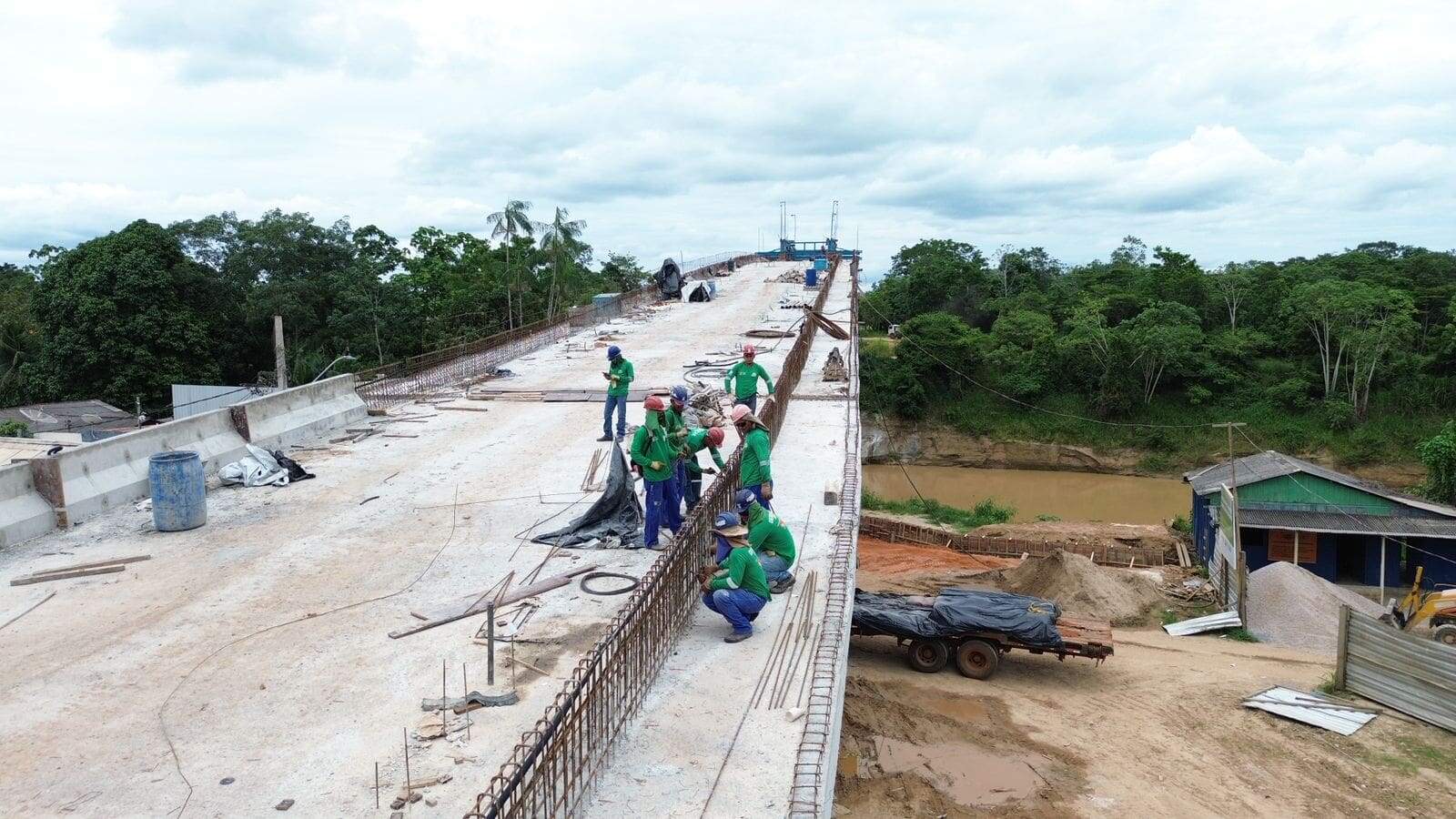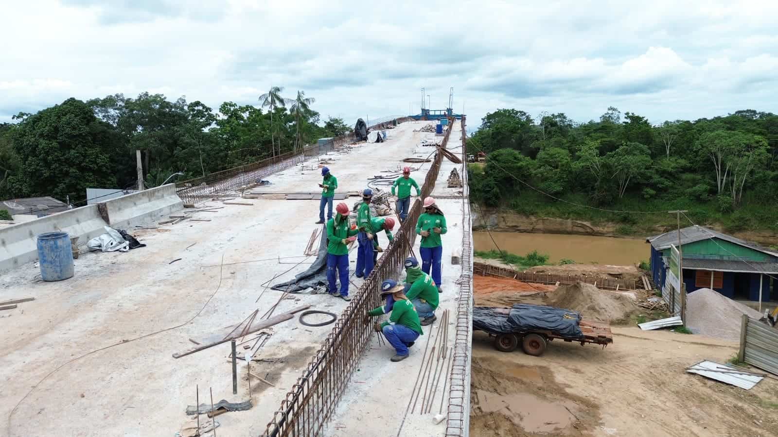 Atualmente, as equipes do Deracre estão concluindo a armação e aplicando estruturas de ferro e concreto que dão resistência e segurança à ponte; instalando os guarda-rodas e nivelando os chumbadores do guarda-corpo, garantindo proteção para veículos e pedestres; iniciando a terraplanagem e a pavimentação, preparando a base da estrada e deixando a superfície pronta para o tráfego; e desmontando as treliças do balanço sucessivo, estruturas provisórias utilizadas para sustentar a ponte durante a construção.
