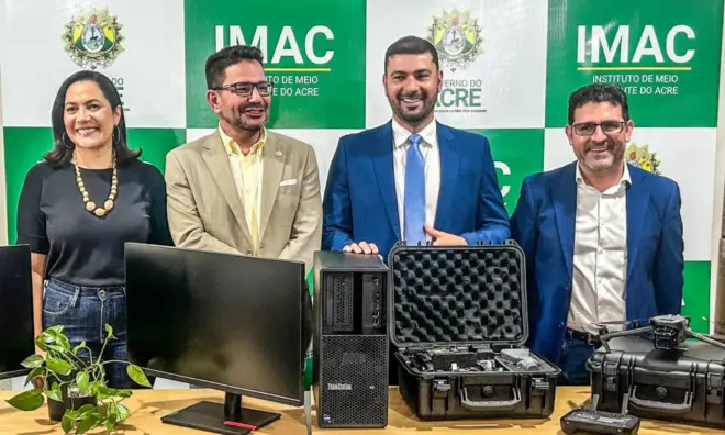 Em cerimônia realizada nesta terça-feira, 15, o governador Gladson Cameli (PP) e o presidente do Instituto de Meio Ambiente do Acre (Imac), André Hassem, realizaram a entrega de novos equipamentos à autarquia ambiental. Ao todo, foram investidos R$ 1.254.700,00 em materiais, incluindo 85 computadores, entre notebooks, desktops e 10 drones, que irão reforçar o trabalho de fiscalização e monitoramento ambiental no estado.