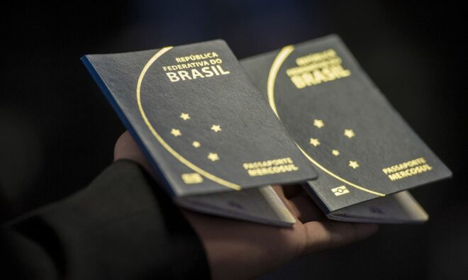 Novo passaporte comum eletrônico brasileiro. O documento passou a ser emitido desde a última segunda -feira (6) pela Polícia Federal e Casa da Moeda, e terá prazo de validade de 10 anos (Marcelo Camargo/Agência Brasil)