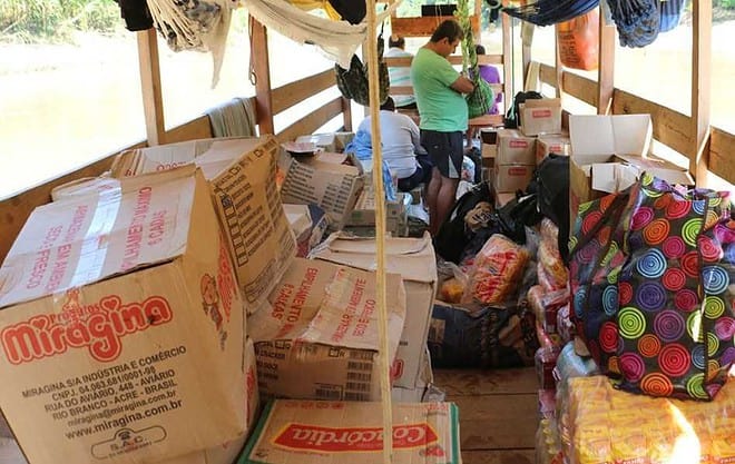 Batelão transporta caixas de bolachas e de outros alimentos para a merenda escolar; garantir a comida a todos os alunos é uma prioridade para o governo do Estado (Foto: Mardilson Gomes/Asscom SEE)