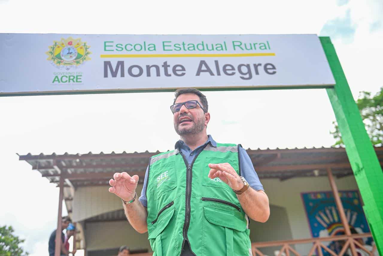 “Ou seja, nós estamos falando aí mais de 400 escolas e 395 anexos. O que é que são anexos? Isso aqui é uma escola, mas existe sala de aula ao longo dessa estrada, que é uma pequena sala de aula onde você descentraliza pra ficar anexo de uma escola central. São 394. Essa magnitude, essa diversidade, colocando a escola na floresta, colocando a escola na comunidade, valorizando a população local, que ele fique na sua área, não vá pra cidade que os erros de 80, de 90, nós sabemos o efeito social que sofremos hoje, o governo descentraliza o seu processo de educação. Hoje, são 70 escolas indígenas, destas 70, nós já entregamos mais de 40 escolas para a população. Das escolas do campo, nós também já entregamos 48 e essa é uma demonstração de uma escola”, disse.