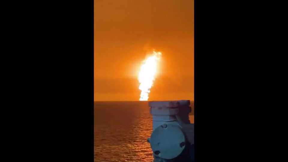 Chamas são vistas no Mar Cáspio após grande explosão na costa do Azerbaijão| Foto: Reprodução / Twitter / Liveuamap