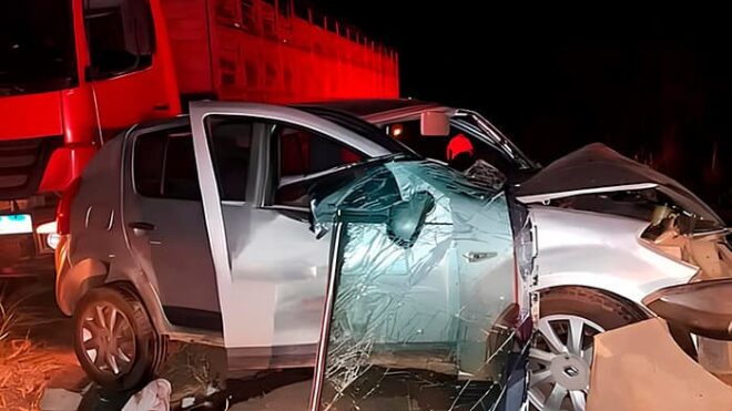 Com a batida, motorista da carreta acabou perdendo o controle da direção e colidiu frontalmente com outro carro, ocupado por cinco pessoas da mesma família.