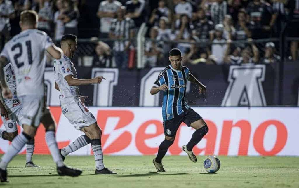 Aos 24′, quase que o Grêmio marca o primeiro do jogo, com Everton Galdino, que finalizou de perna esquerda e obrigou o goleiro Rafael Santos a colocar para escanteio. Quase que Galdino marca! Na sequência, foi a vez do atacante Nathan Fernandes arriscar em jogada individual uma finalização cruzada. A bola foi forte e desviada para a defesa, no susto, do goleiro adversário. O Grêmio melhora no jogo após a entrada de Nathan Fernandes.