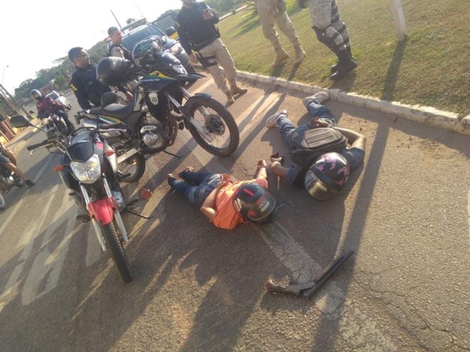 Uma delas, a Yamaha Fazer, de cor preta, Placa MZW 9622, foi encontrada, após denúncia, em uma área de mata na Rua Gomes Machado, bairro Cadeia Velha. Em consulta via CIOSP, foi constatada a restrição de roubo do veículo, que foi encaminhado para o pátio do Detran/AC.