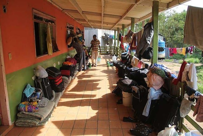 A casa em que se encontram os pouco mais de 400 haitianos, se tornou um caos. O pouco espaço é divido entre sete crianças recém-nascidas e cerca de 90 mulheres. A alimentação é dividida conforme as doações feitas por empresários locais e de outras cidades que chegam em dias incertos.