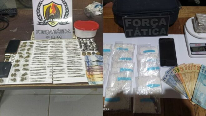 Uma mesma guarnição da Força Tática do 1º Batalhão da Polícia Militar do Acre (PMAC) prendeu um homem no Bujari e apreendeu um menor de idade no bairro Mocinha Magalhães, em Rio Branco, por tráfico de drogas. Ambas as ocorrências ocorreram entre os dias 31 de dezembro e 1 de janeiro, durante os preparativos e comemorações da virada do ano.