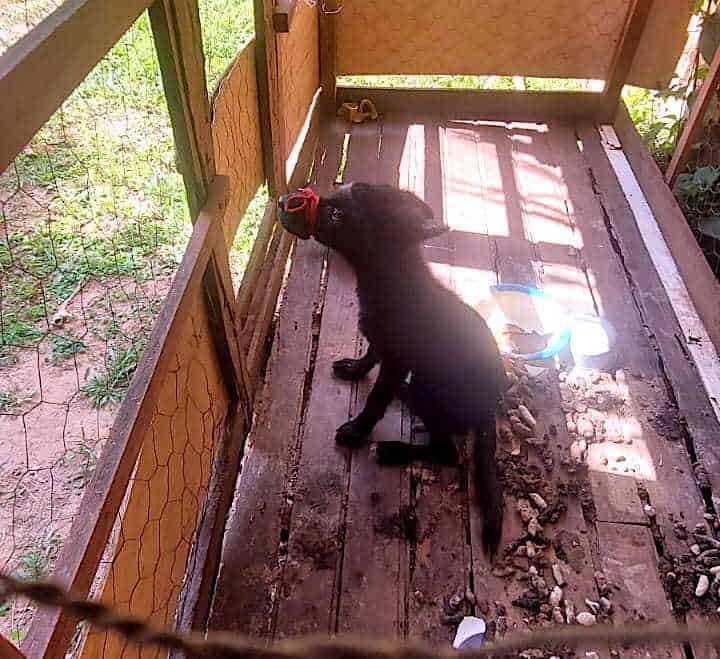 Uma equipe se deslocou até o endereço, onde encontraram um cão com menos de um ano de vida, com o seu focinho amarrado com um barbante dentro de uma ‘casinha’, em meio a fezes do animal.