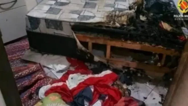 Quando os policiais militares chegaram ao local, os bombeiros já tinham extinguido o incêndio. A cama ficou destruída.