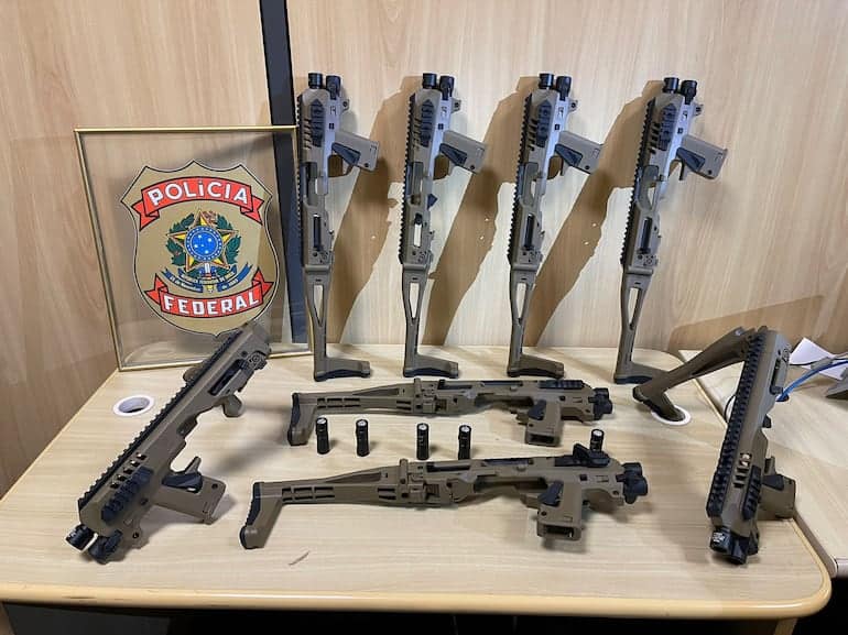 Na ação, foram apreendidos oito acessórios conhecidos como “kit Roni”. O material consegue transformar armas de fogo semiautomáticas em automáticas.