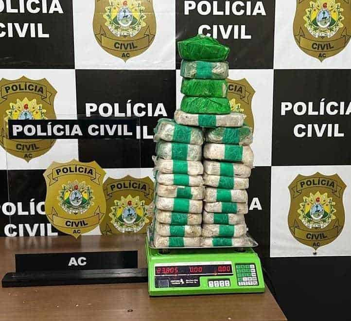 Nas primeiras horas desta quarta-feira, 20, a Polícia Civil o município de Cruzeiro do Sul prendeu, em flagrante delito, pelo crime de trafico de drogas, W. de P. F. de 38 anos, em posse de 23.6 kg de cocaína que tinham como destino a cidade de Rio Branco.