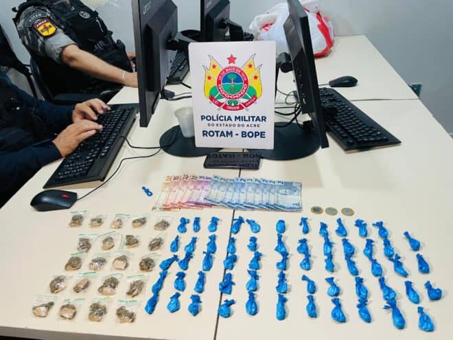 Durante patrulhamento de rotina na noite desta sexta-feira (16), policiais da Companhia de Rondas Ostensivas Táticas Metropolitanas (ROTAM), do Batalhão de Operações Especiais (BOPE), prenderam em flagrante Jhonny Wilson Lima Mendonça, de 23 anos, por tráfico de drogas. A ação ocorreu em um beco próximo à rua Tarauacá, na área conhecida como invasão do bairro Rui Lino, em Rio Branco.