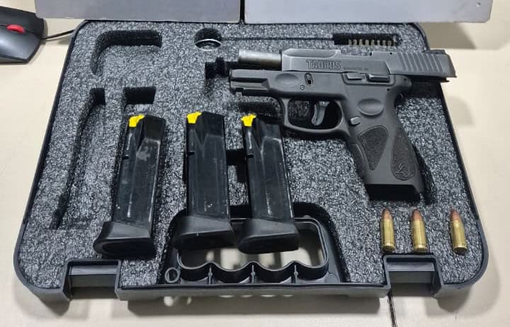 Durante a busca no veículo, foi encontrada uma maleta contendo uma pistola calibre .9mm, três carregadores e três munições intactas. O homem apresentou o registro de posse da arma, mas não possuía autorização para o porte. Ele recebeu voz de prisão e foi conduzido à Delegacia Central de Flagrantes, juntamente com o armamento apreendido.