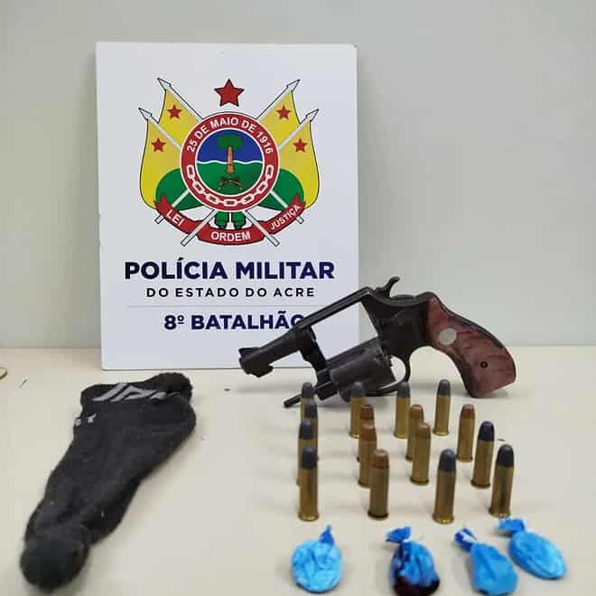 Militares apreendem revólver, munições e drogas; um dos suspeitos segue foragido