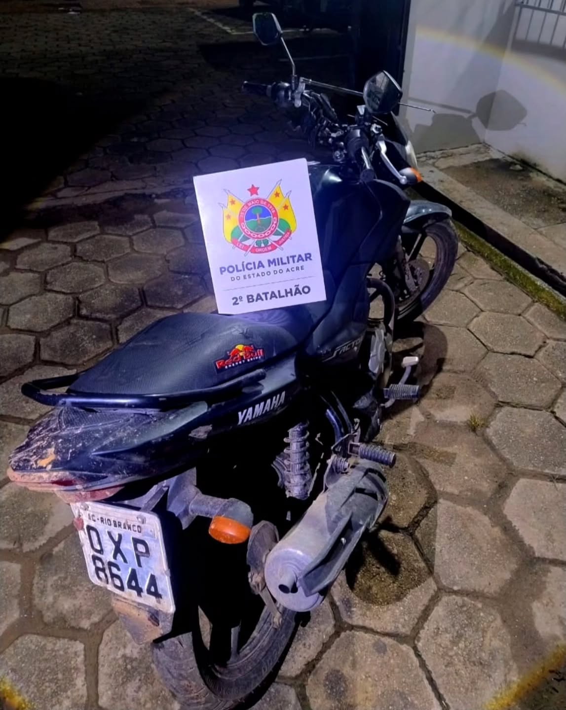 Durante a verificação, foi feita a consulta da placa da moto — uma Yamaha Factor 125, de cor preta — e constatado que o veículo possuía restrição de roubo registrada no dia 6 de janeiro de 2026.