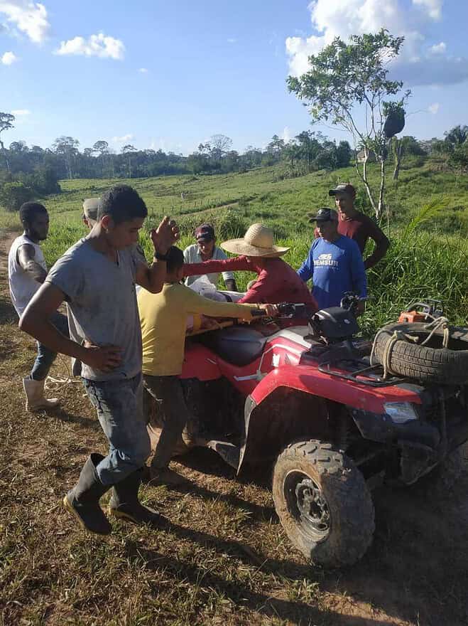 Devido à distância a equipe do socorro precisou se deslocar até o local em um quadriciclo e encontrou moradores da região que já faziam o transporte da vítima.