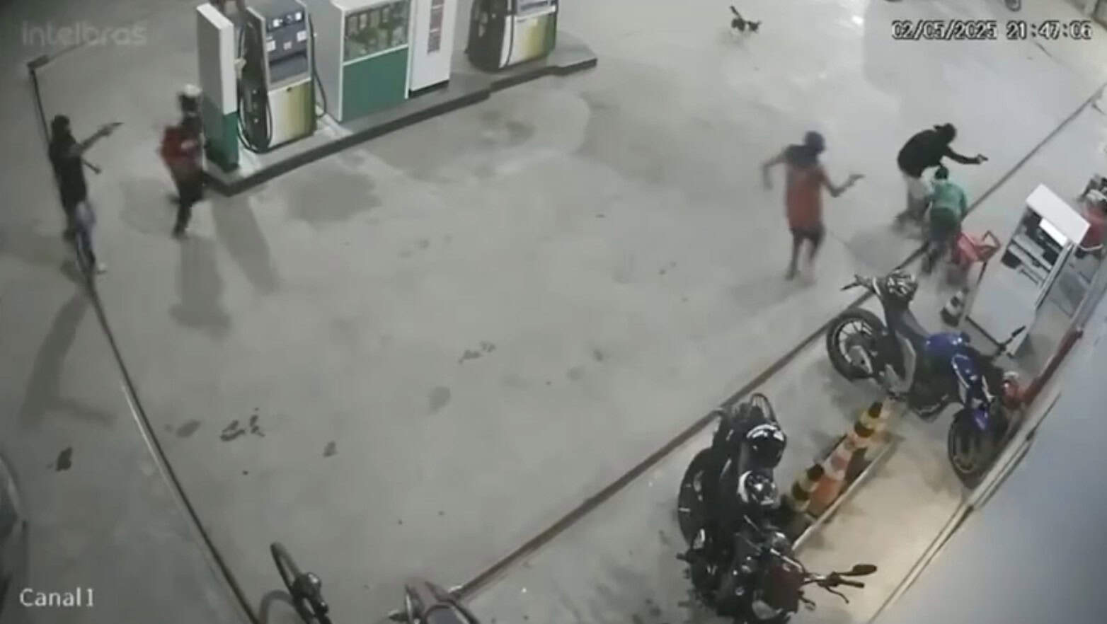 De acordo com as imagens, os suspeitos chegaram ao local portando armas de fogo e um terçado. Eles renderam o frentista e invadiram a loja de conveniência anexa ao posto, de onde levaram dinheiro e produtos da mercearia.