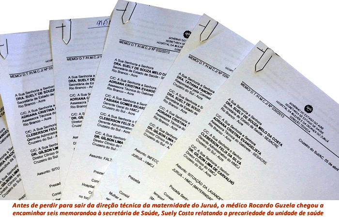 Antes de pedir para sair da função de diretor técnico, Ricardo Guzela encaminhou seis memorandos à secretária Suely Costa – a assessora de gabinete da Sesacre, Adriana Cristina Evangelista – ao diretor clínico do HMCJ, Gilson Lima de Carvalho e, para a responsável pela Comissão de Controle de Infecção Hospitar (CCIH), Tatiana Panont – detalhando todos os problemas de funcionamento do hospital. Os documentos foram apresentados pela deputada estadual Antonia Sales (PMDB), na tribuna na Assembleia Legislativa.