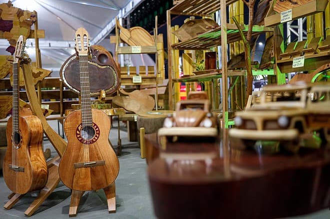 Instrumentos musicais produzidos por detentos são expostos em estandes da feira agropecuária do Juruá. Foto: José