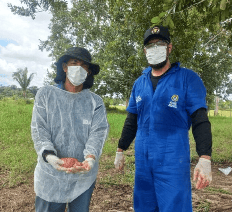 Seguindo protocolos de segurança preconizada pelo Ministério da Agricultura, Pecuária e Abastecimento (Mapa), por intermédio do Programa Nacional de Controle da Raiva dos Herbívoros (PNCRH), técnicos do Instituto de Defesa Agropecuária e Florestal do Acre (Idaf), dos municípios de Tarauacá e Feijó, realizaram no sábado, 4, nas mediações do Seringal Itamaraty, no Rio Murú, em Tarauacá, uma coleta de amostras de tecido nervoso para diagnóstico de raiva dos herbívoros.
