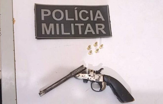 Os policiais prenderam na noite deste domingo, 23, no bairro Raimundo Chaar J.B.R de 67 anos com uma garrucha Cal. 22, municiada e mais 4 munição intacta no bolso do indivíduo.