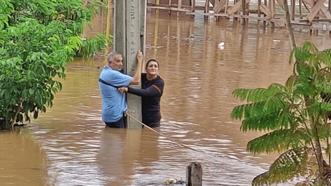 Segundo informações de Jair, o idoso achou que conseguiria trafegar pela avenida, que está alagada, e acabou boiando na correnteza. Não restando outra alternativa, o homem pulou do interior do veículo e se agarrou ao único ponto que não flutuava no local; um poste de energia.