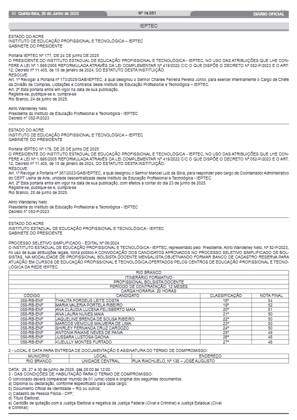 O Instituto Estadual de Educação Profissional e Tecnológica do Acre (Ieptec) convocou nesta quinta-feira, 26, os candidatos aprovados no seletivo simplificado de bolsistas docentes, regido pelo Edital nº 06/2024. A convocação, publicada no Diário Oficial do Estado (DOE), refere-se à formação de banco de cadastro reserva para atuação nos cursos profissionalizantes ofertados pelos centros da rede Ieptec no estado.