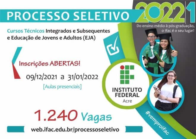 O Instituto Federal do Acre (Ifac) está com inscrições abertas para o Processo Seletivo 2022/1 de cursos técnicos integrados e subsequentes. Ao todo, estão sendo ofertadas 1.240 vagas para ingresso em 2022 em cursos nos campi Baixada do Sol, Cruzeiro do Sul, Rio Branco, Sena Madureira, Tarauacá e Xapuri. As inscrições são gratuitas e podem ser feitas pelo site web.ifac.edu.br/