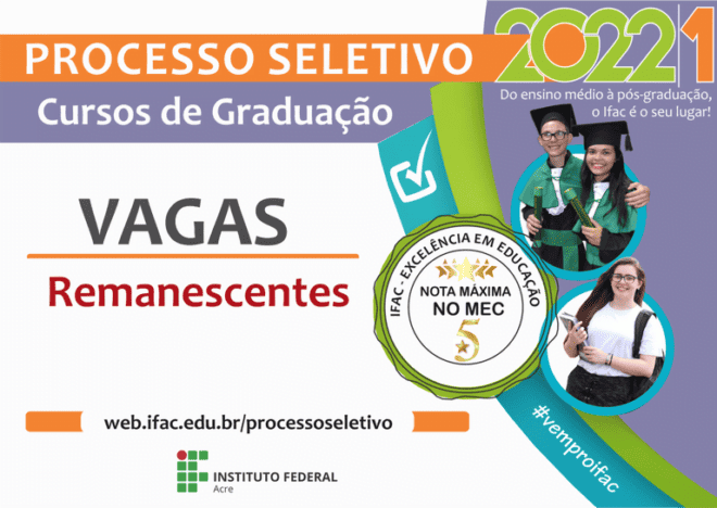O Instituto Federal do Acre (Ifac) publicou editais de vagas remanescentes em cursos superiores nos campi Cruzeiro do Sul, Sena Madureira, Tarauacá e Xapuri. As inscrições deverão ser feitas pela internet, no site https://web.ifac.edu.br/