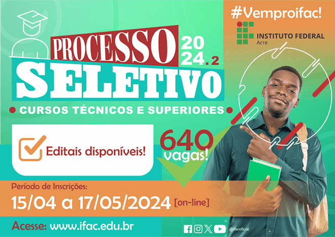 O Instituto Federal do Acre (Ifac) lançou, nesta quinta-feira (11.04), os editais para o Processo Seletivo 2024/2 de cursos técnicos subsequentes e superiores. Ao todo, estão sendo ofertadas 640 vagas para os campi Baixada do Sol, Cruzeiro do Sul, Rio Branco e para o Centro de Referência do Ifac em Epitaciolândia.