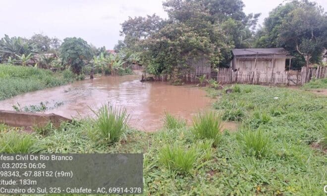 O Igarapé Batista, localizado em Rio Branco, transbordou na noite de terça-feira (4) devido às fortes chuvas que atingiram a capital acreana. Na manhã desta quarta-feira (5), equipes da Defesa Civil Municipal realizaram uma vistoria na região e constataram alagamentos em pontos do bairro Calafate, principalmente próximo ao conjunto Laélia Alcântara.