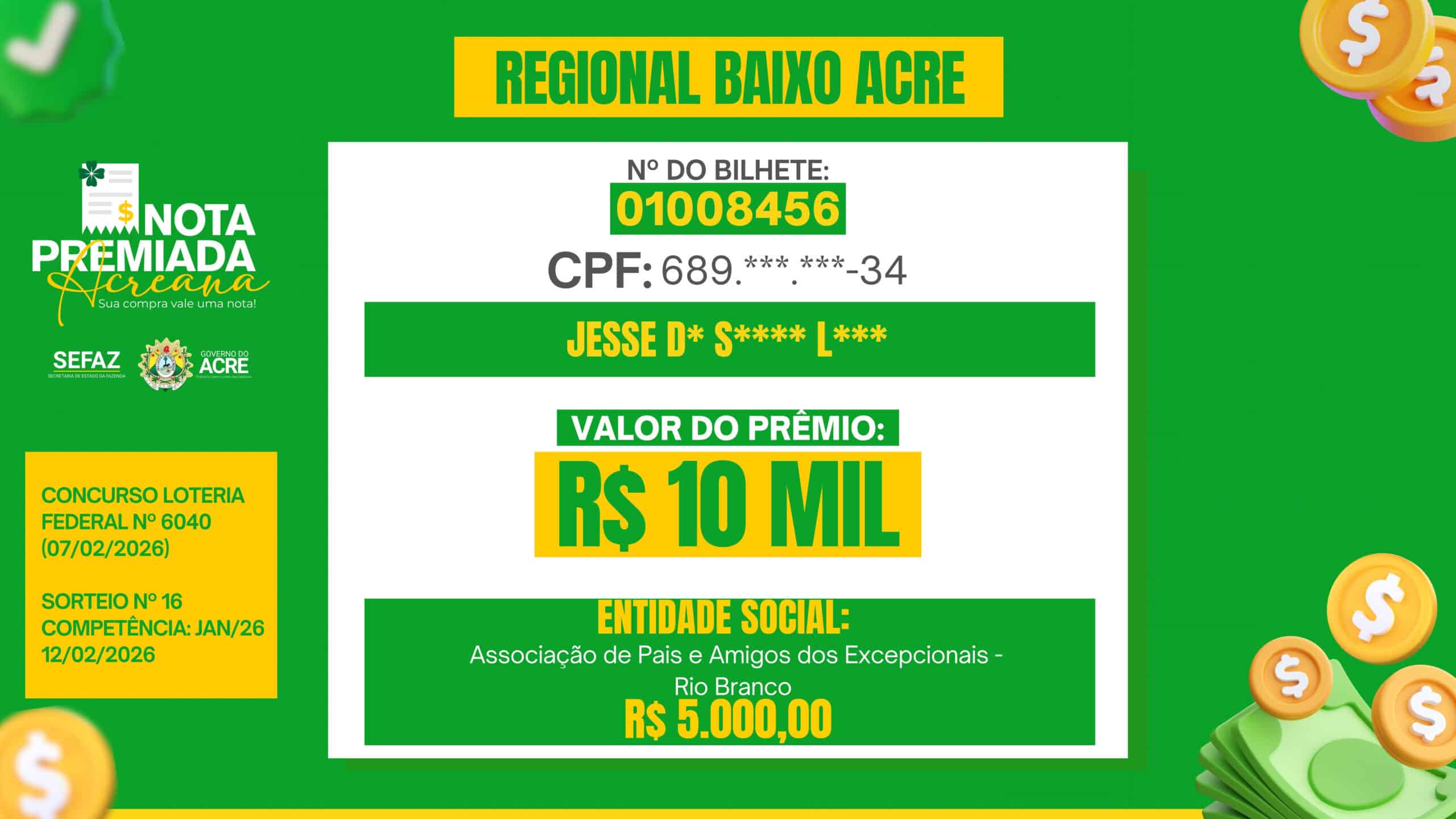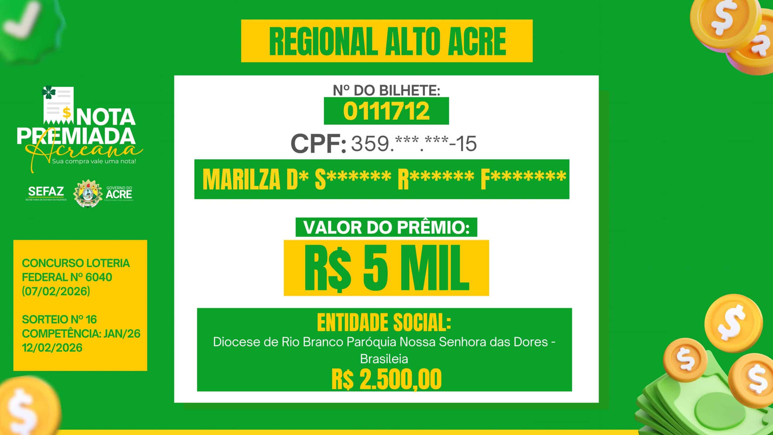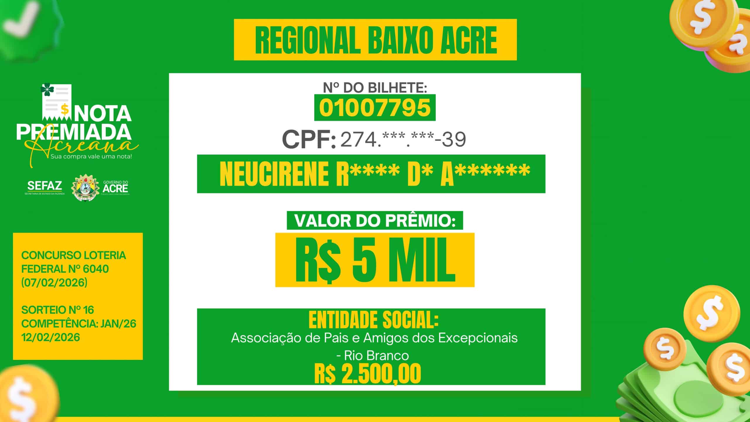 Nota Premiada Acreana distribui mais de R$ 260 mil e divulga vencedores do sorteio de janeiro; veja nomes