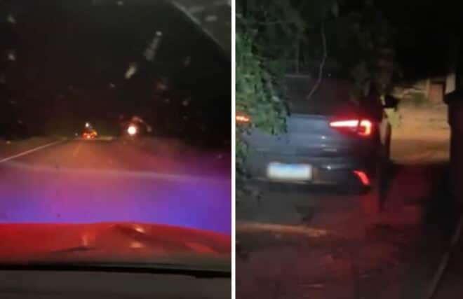 As imagens são impressionantes e mostram que o veículo roubado, que estava com os proprietários dentro, se deslocava a 180 km por hora sendo perseguido pelos policiais do Grupo Especial de Fronteira (GEFRON).