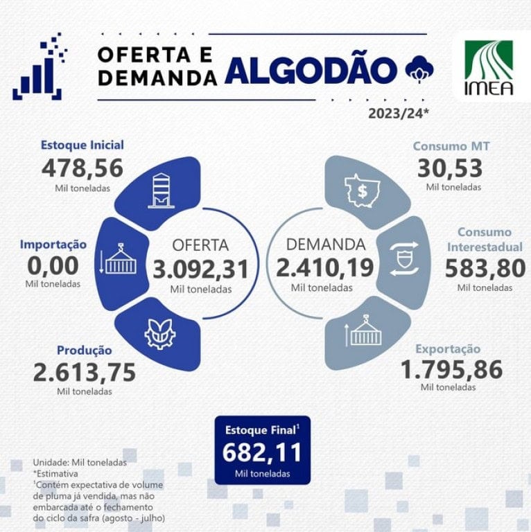O Instituto Mato-Grossense de Economia Agropecuária (Imea) divulgou novas estimativas para a oferta e demanda de algodão em Mato Grosso na safra 2023/24, revelando um cenário de crescimento significativo na produção e nas exportações.