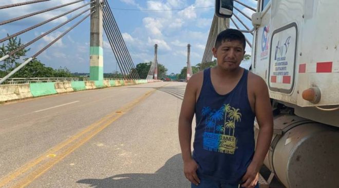 Palomino afirma que, nos dias em que está parado sobre a ponte, caminhões carregados de milho e de castanha foram autorizados a entrar no Peru.