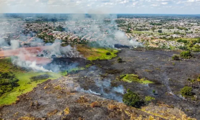 As chamas se espalharam por uma área próxima ao antigo acampamento Marielle Franco. As labaredas altas e a densa fumaça são visíveis de pontos da cidade. Imagens aéreas feitas pelo drone do ac24horas mostram a dimensão do incêndio, que destruiu grande parte do pasto e da vegetação local.