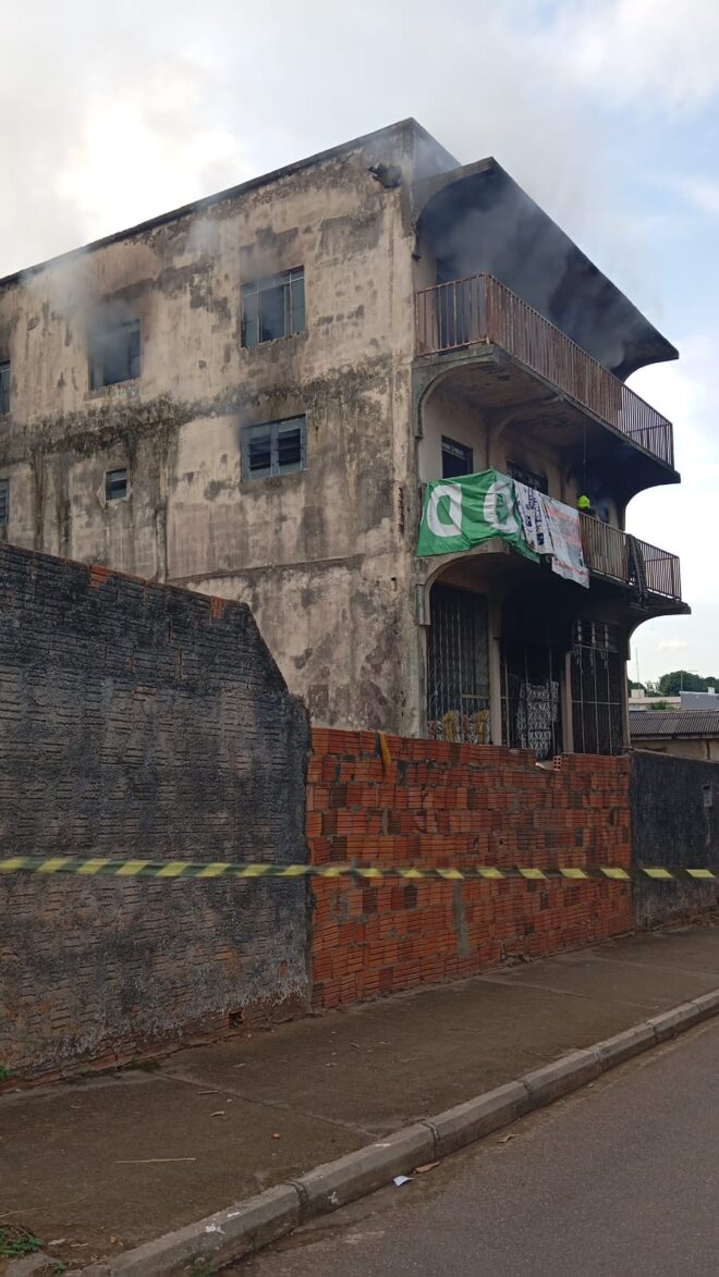 Fogo de grandes proporções mobiliza Corpo de Bombeiros em edifício utilizado como abrigo no bairro do Bosque.