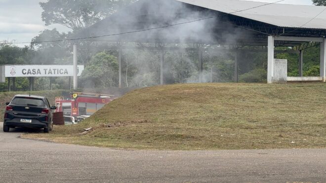 Chamas atingiram pneus usados em treinamentos; fogo foi controlado pelo Corpo de Bombeiros